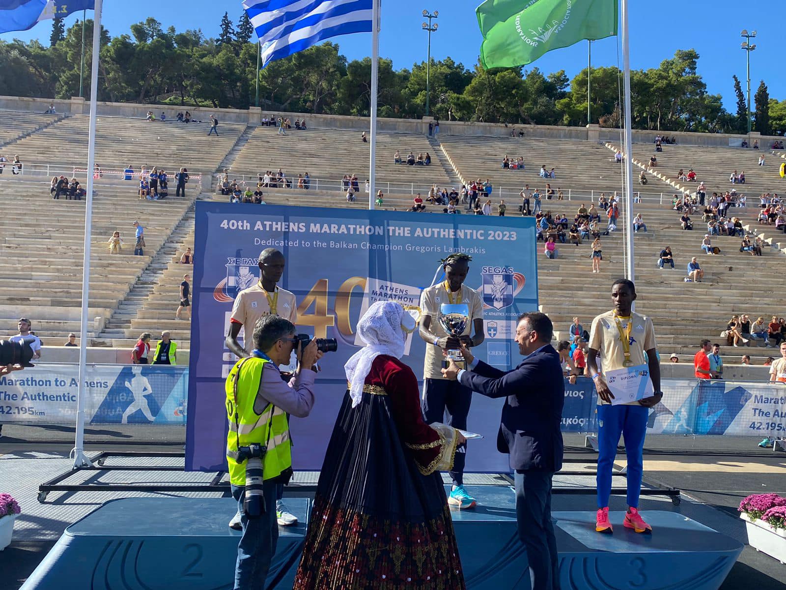 «Σήμερα, είχα τη χαρά και τη μεγάλη τιμή να υποδεχτώ και να βραβεύσω εδώ στο Καλλιμάρμαρο Στάδιο τον πρώτο των πρώτων αθλητή-δρομέα, Κενυάτη Έντουιν Κίπροπ Κίπτο, ο οποίος τερμάτισε πρώτος, σημειώνοντας μάλιστα νέο ρεκόρ αγώνα για την Κλασική Μαραθώνια Διαδρομή, με 2:10:34, καταρρίπτοντας το προηγούμενο ρεκόρ!
